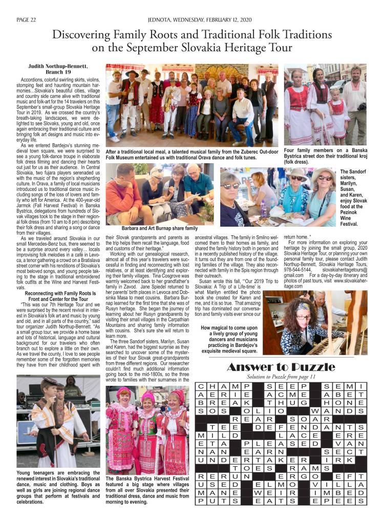 The 2019 Slovakia Heritage Tour is featured in the 12 February 2020 issue of Jednota [p.22]: (CLICK IMAGE TO ENLARGE & READ)